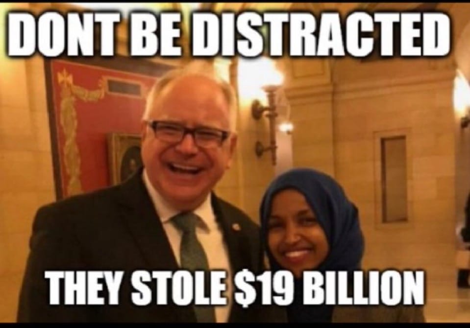 When Democrats win seats, whether they be local or federal, they move to handicap our nation overseas and exploit it for personal gain domestically. It should surprise absolutely no one that Representative Ilham Omar worked hand in glove with Governor Walz to fraudulently bill & exploit Minnesota’s public health care system. Omar’s Muslim community stole $19 billion in federal tax payer assistance and in exchange - she delivered the support & votes of the Somali community for the Democrats. I say “hand in glove” exactly because Governor Walz is under federal investigation for acting to intimidate or prevent Minnesota state regulators from discovering or publicly disclosing the theft of these public funds. The people who vote for Democrats may be good intentioned people but good intentions are the bricks that also often pave the way to hell.